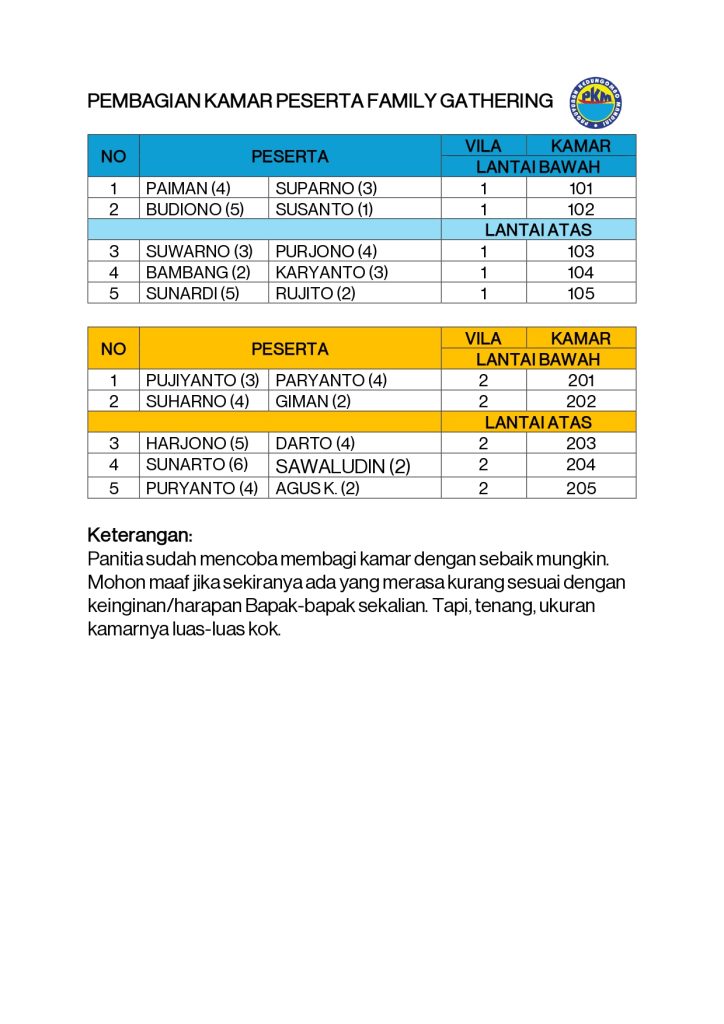 Pembagian Kamar Peserta Family Gathering PKM 2025
